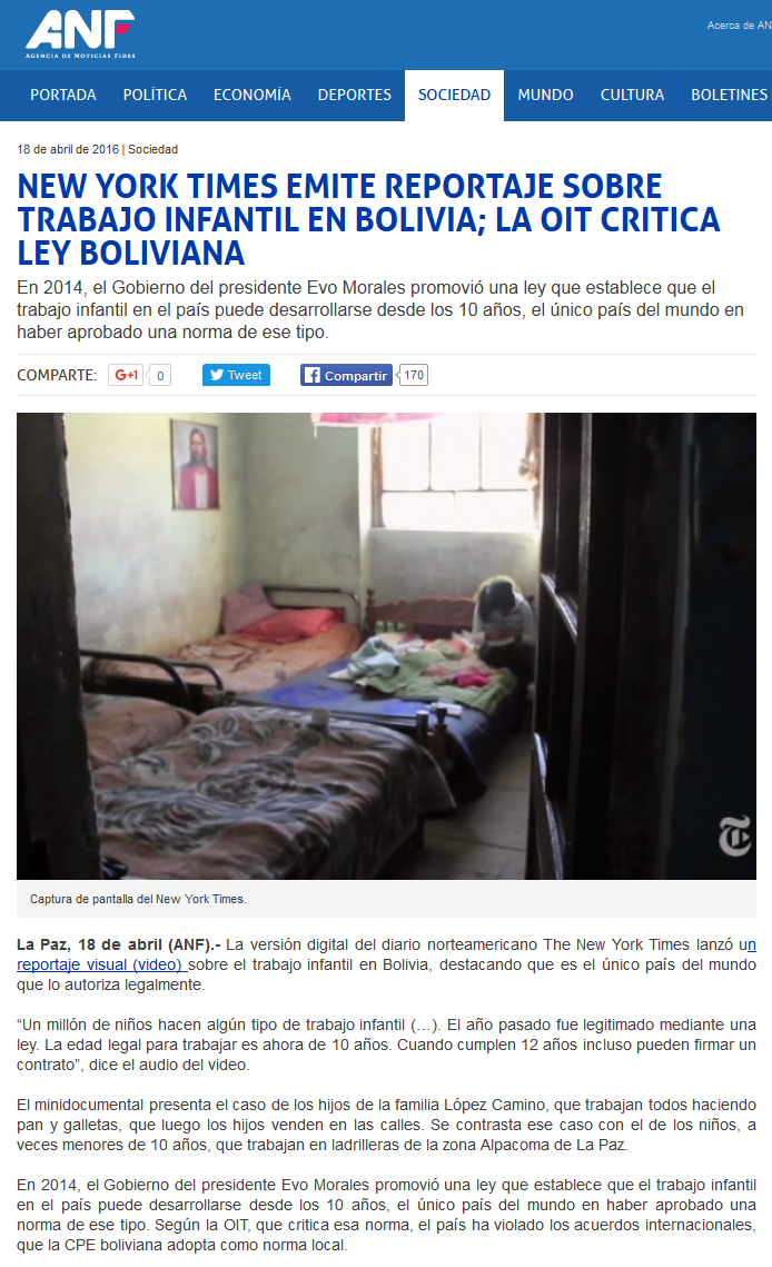La versión digital del diario norteamericano The New York Times lanzó un reportaje visual (video) sobre el trabajo infantil en Bolivia, destacando que es el único país del mundo que lo autoriza legalmente.