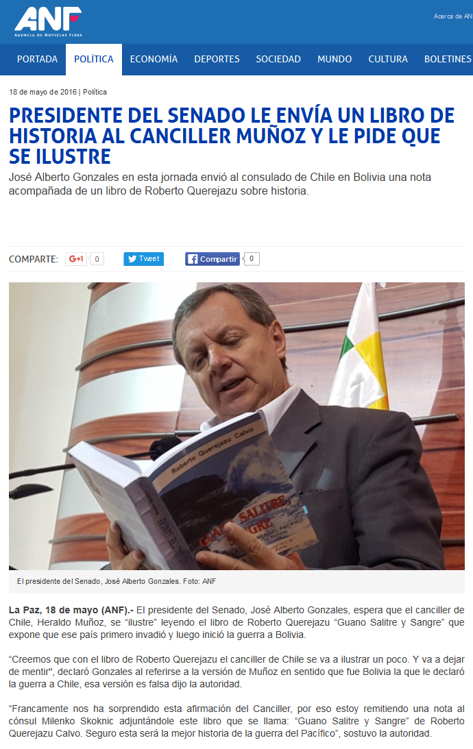 La Paz, 18 de mayo (ANF).- El presidente del Senado, José Alberto Gonzales, espera que el canciller de Chile, Heraldo Muñoz, se “ilustre” leyendo el libro de Roberto Querejazu “Guano Salitre y Sangre” que expone que ese país primero invadió y luego inició la guerra a Bolivia.